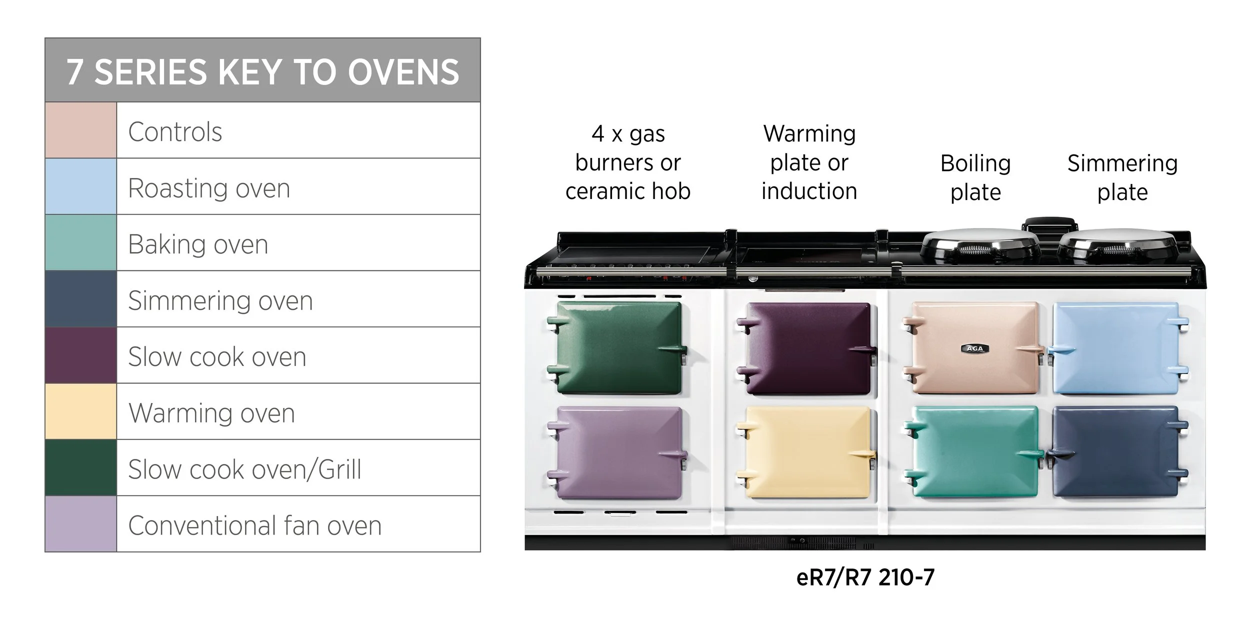 The AGA R7 210 features three cast-iron heat storage ovens for roasting, baking and simmering and offers two hotplates which can be switched on and off independently of the ovens, and each other, and heat up in 10 to 12 minutes.